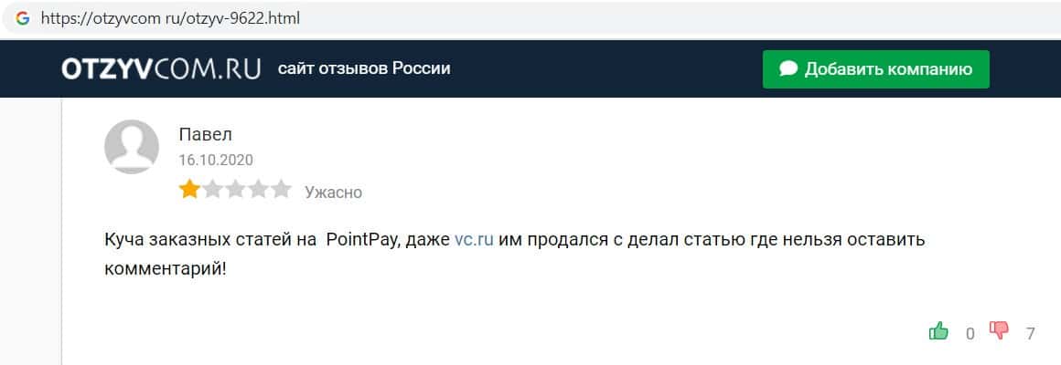 В данном отзыве пользователь написал, что контора PointPay публикует заказные статьи и платит отзовикам, чтобы интернет - пользователи не могли писать негативные отзывы.