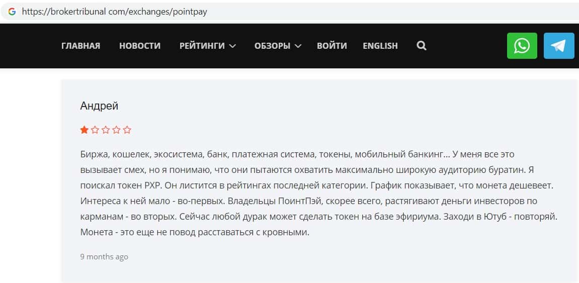 В сети существуют авторитетные источники, на которых трейдеры могут проверить любого брокера на мошенничество и степень доверия пользователей. На одном из них мы проверили лохокухню PointPay, в итоге за 2,5 года существования домена нет ни одной положительной оценки от пользователей! Это как минимум неприемлемо для серьезного брокера и вложений!