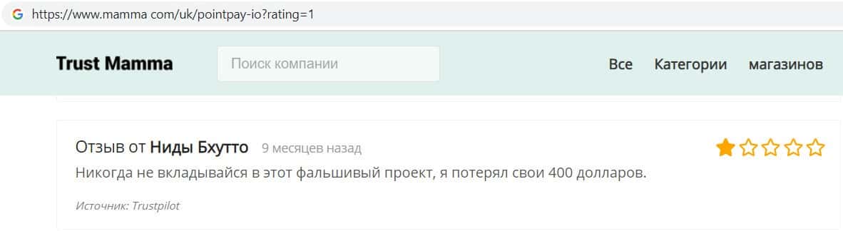 Перед вами отзыв бывшего клиента компании кидал PointPay. В данном отзыве пользователь предупреждает о мошенниках, которые смогли отнять у него 400 долларов.