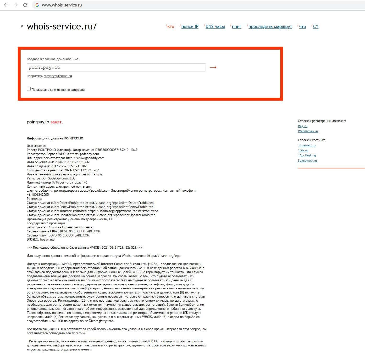 Мы использовали сайт whois-service ru, чтобы узнать владельца доменного адреса кидал Поинт Пэй. Оказалось, что жулики скрывают данную информацию от пользователей.