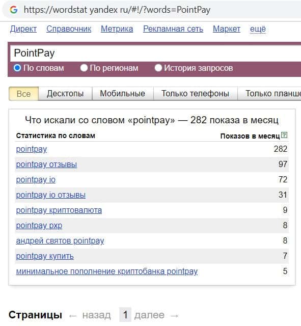 - Количество запросов мошеннического проекта PointPay в Яндексе