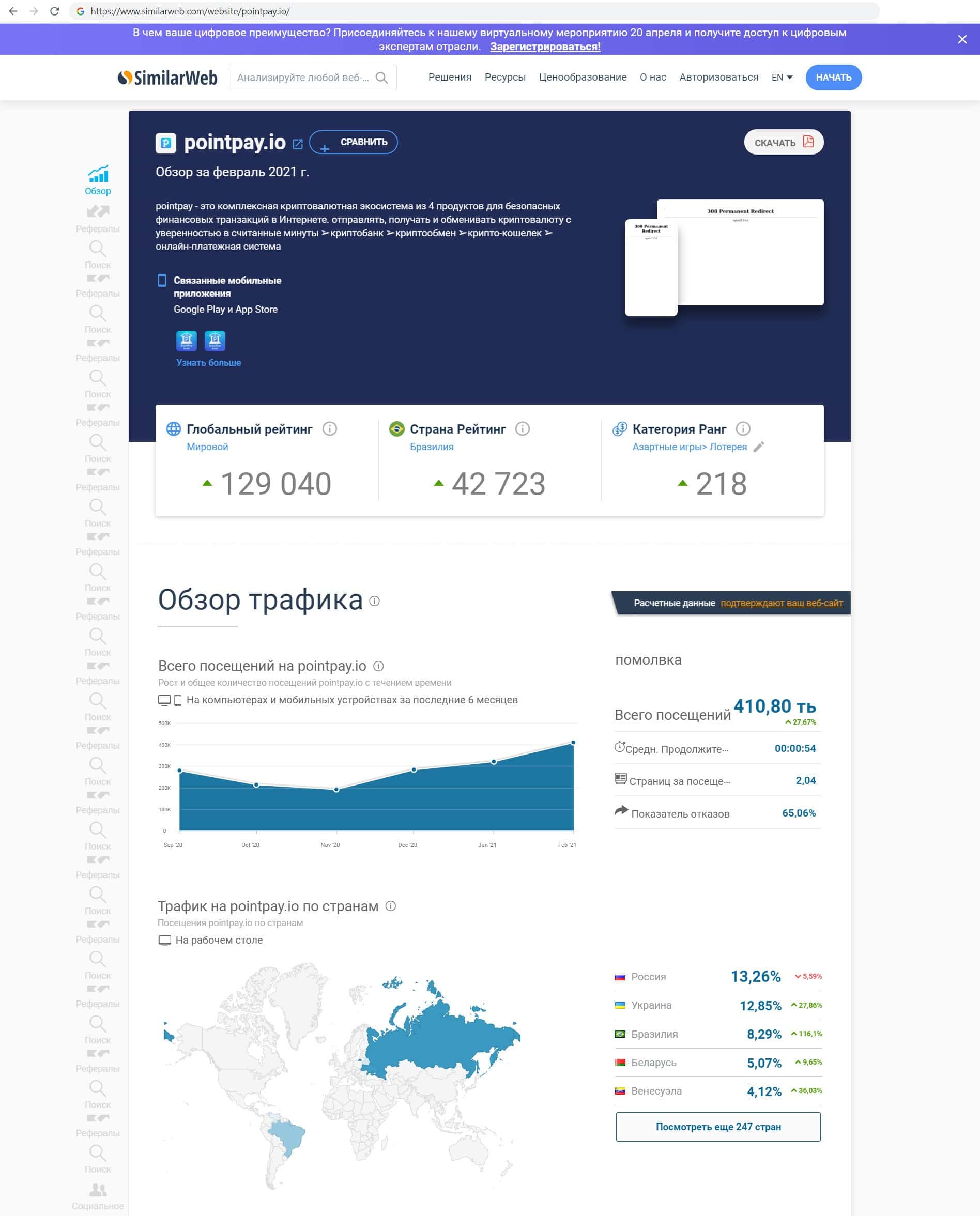 С помощью сайта similarweb com мы решили узнать о трафике сайта разводил PointPay. Оказалось, что интернет - ресурс кидал посещают в основном жители России и Украины.
