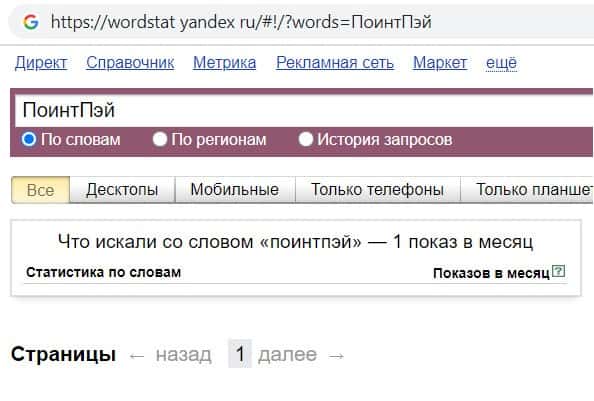Проверили мы так же количество запросов кидал Поинт Пэй по русскоязычному названию без пробела, а именно "ПоинтПэй". Этот запрос пользователи совершили всего лишь 1 раз.