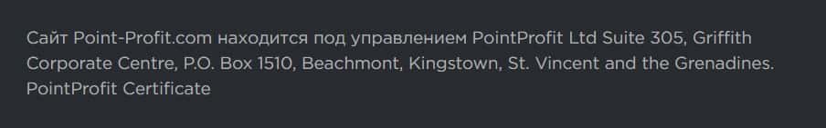 Юридическим лицом компании Поинт Профит является организация PointProfit Ltd, о чем написано на главной странице сайта.