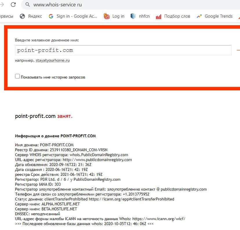 Кому принадлежит доменное имя сайта point-profit com, выяснить нельзя, потому что мошенники скрыли информацию о владельце сайта.