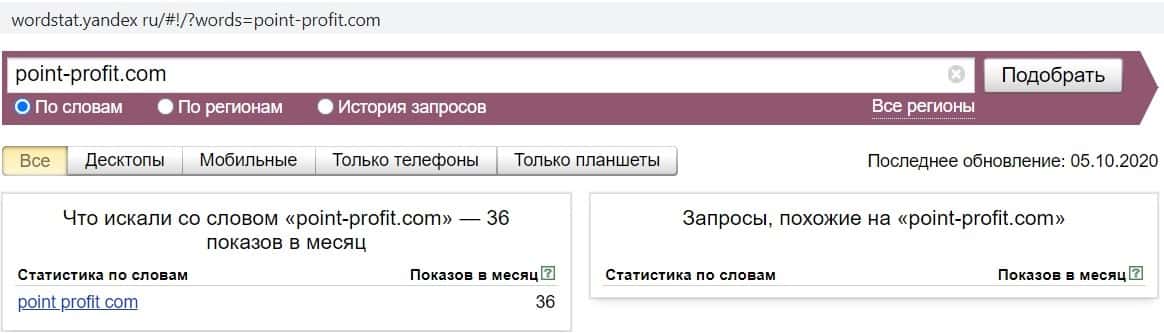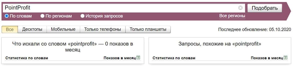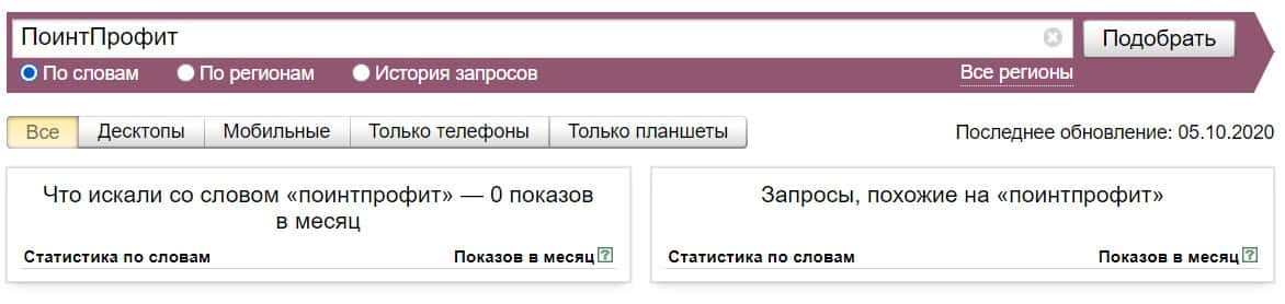 Посмотрим, сколько раз люди искали название бренда "Поинт Профит" на русском языке с пробелом. Незначительное количество запросов.