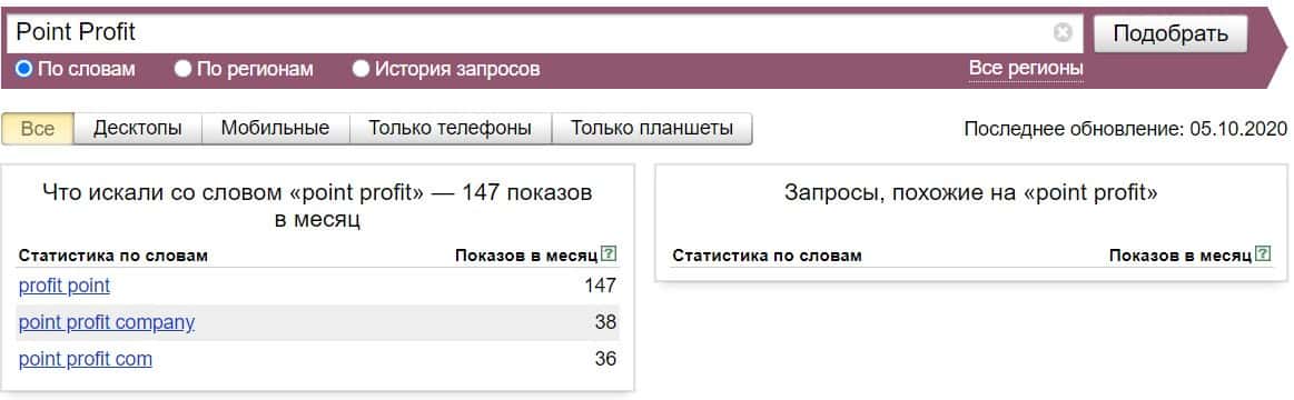 То же название "Point Profit", но написанное с пробелом, пользователи пытались найти в системе Яндекс также не очень часто: всего лишь 147 раз.