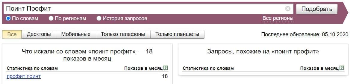 Посмотрим, сколько раз люди искали название бренда "Поинт Профит" на русском языке с пробелом: результат 18 показов.