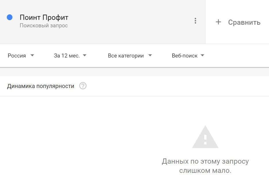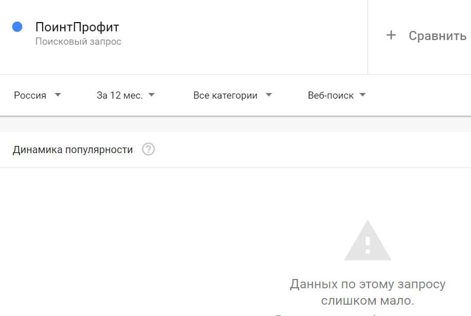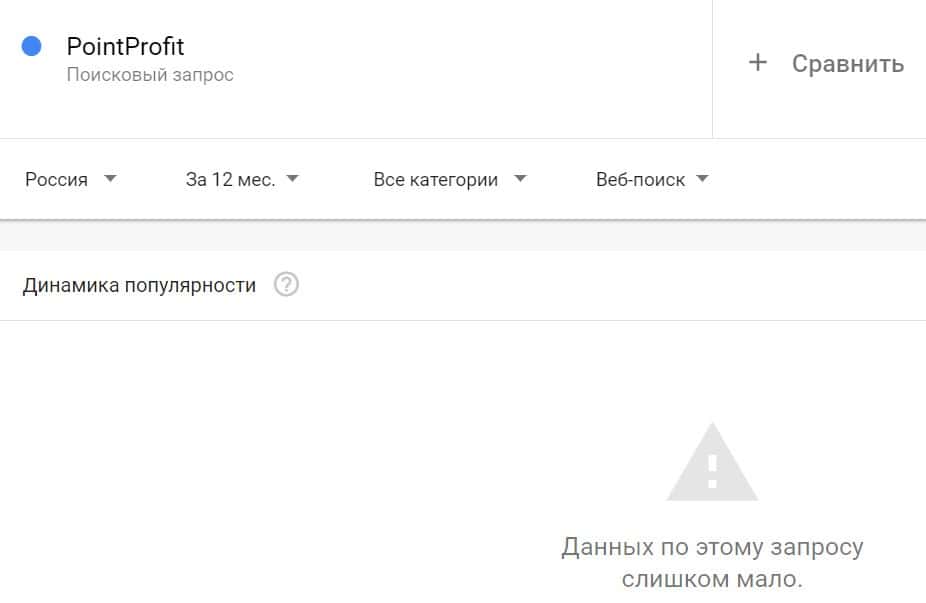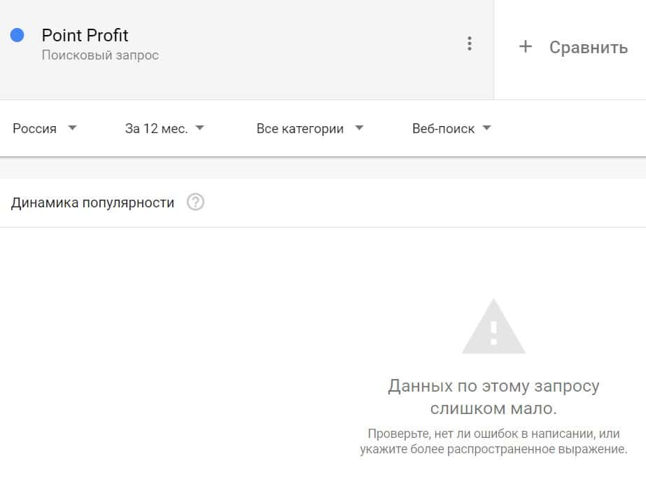Посмотрим, насколько популярно название бренда "PointProfit", написанное на английском языке. Данных по этому запросу нет, так как никто не искал этот бренд в Гугл.