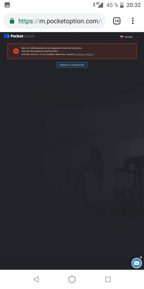 Не полученный доступ к личному кабинету клиента конторы Pocket Option, мошенники объяснили нарушением политики компании, а в итоге записали пункт Closed by Client.