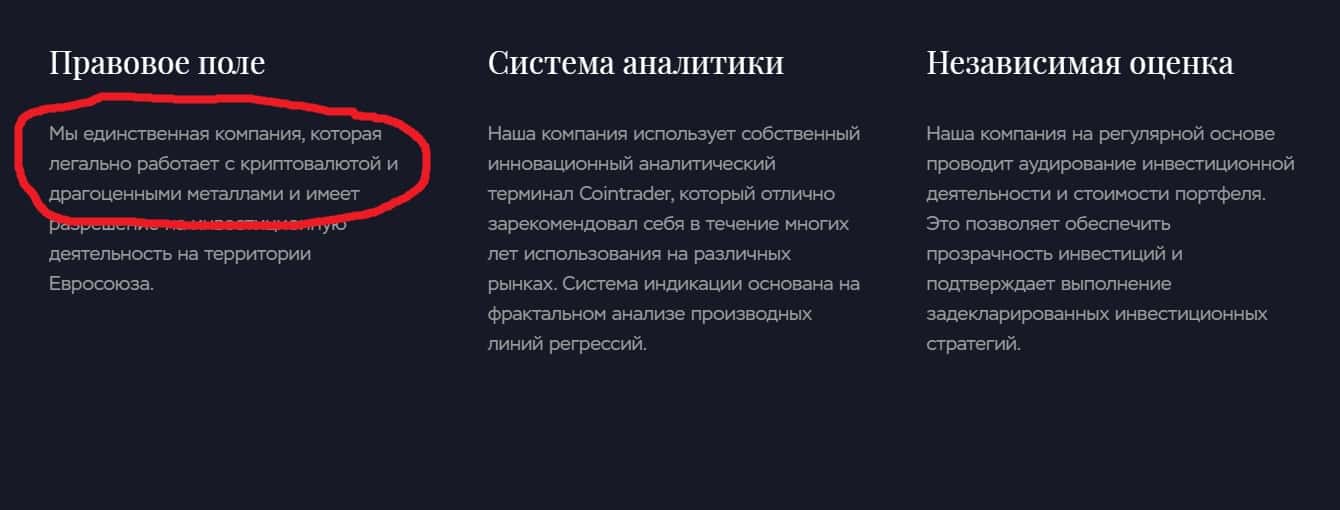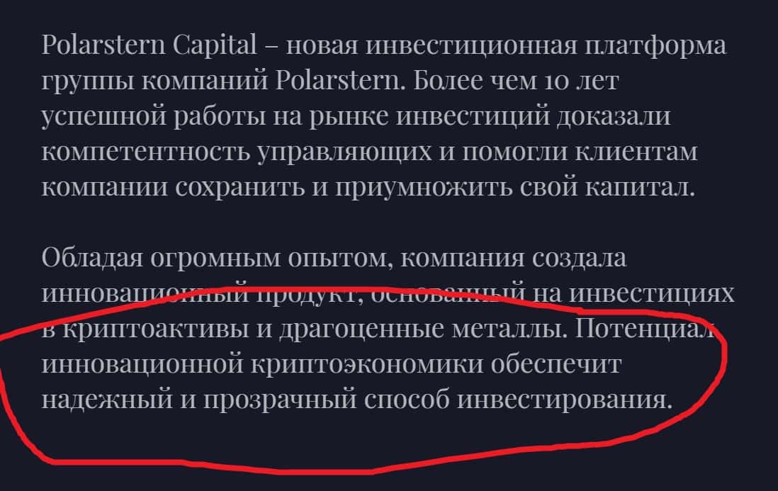 Далее вранье по поводу деятельности компании продолжается - организаторы проекта называют себя единственными, кто легально работает с криптой и драгоценными металлами. Все это пишется для того, чтобы люди, не связанные с этой темой, поверили в уникальность Поларстерн и доверили ей свои деньги.