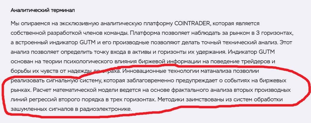 Переходим в раздел сайта Поларштерн Кэпитал, рассказывающий нам об их уникальном инновационном продукте. Очень много непонятных простым пользователям терминов, наблюдается запутанность текста, оперирование заумными словами. Особое внимание привлекает пункт Аналитический терминал. Там нам говориться о создании некой сигнальной системы, которая предупреждает трейдера о событиях на бирже. Далее идет набор математических терминов, из которых малопонятен принцип работы данной системы.