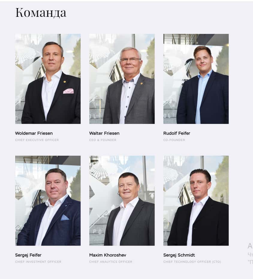 Руководители компании Polarstern capital не скрывают свои лица, видимо, они уверены в своей полной безнаказанности. Перейдя на вкладку Команда, можно увидеть фото и имена участников данного проекта. В их числе Вольдемар Фризен, на которого зарегистрированы документы.