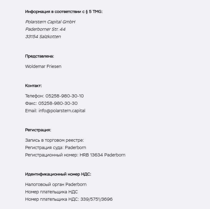 На сайте Polarstern capital нет никакой информации о том, имеет ли данная компания лицензию на проведение финансовых операций. Также нет и клиентского соглашения. На вкладке Реквизиты указан юридический адрес и телефоны организации, а также имейл. Далее вы можете видеть номер регистрации в торговом реестре и идентификационный номер налогоплательщика.