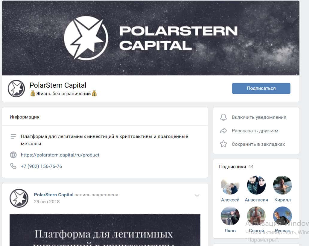 Polarstern capital имеет несколько аккаунтов в известных соцсетях. Это Телеграм, Фейсбук, linkedin. Также они есть и в ВК. Аккаунт в ВК мертвый, последняя запись была опубликована в октябре 2018 года. На группу подписаны всего 44 человека. В Фейсбуке дела немного лучше - более 300 подписчиков. Видимо, пиар все-таки не настолько удачный...