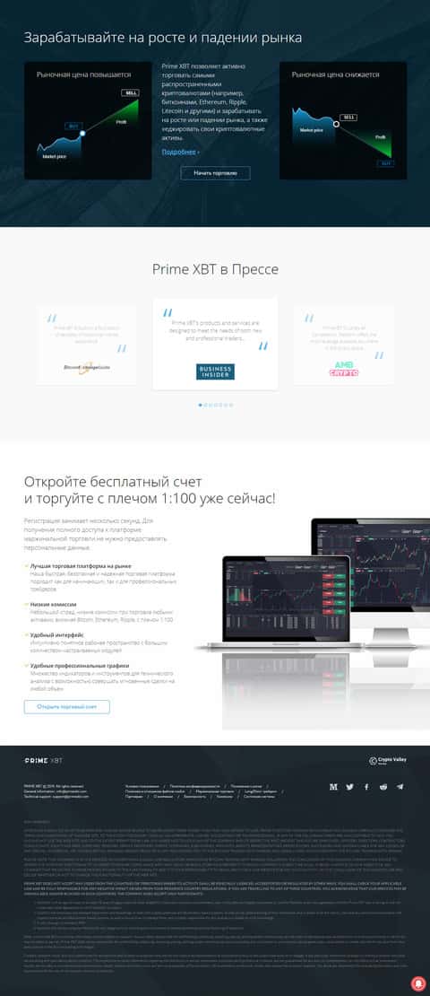 Вторая часть сайта Прайм Х БТ предлагает клиентам почитать в прессе выдуманные статьи о них, поторговать на понижение криптовалюты и скачать торговую платформу. Таким образом жулики заманивают в свою кухню клиентов, которые клюнули на тему торговли на криптовалютном рынке.