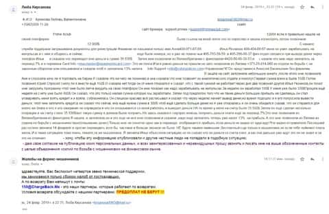 Потерпевшая от лап мошенников рассказала нам, как аферисты брокерской кухни Прайм Икс Клуб выманили у нее свыше 300 долларов. Начался развод со звонка Алины Климовой, которая представилась трейдером конторы и предложила перевести 10 000 рублей, чтобы открыть торговый счет и начать зарабатывать. Она создала какой-то виртуальный кошелек Киви и положила деньги туда. Через несколько часов он был заблокирован и после набрал аналитик Илья Резников. Женщина стала просить помочь разблокировать счет, но он стал игнорировать эти вопросы и потом вовсе скрылся. Надежда осталась на сервис ChargeBack.Me куда она уже и отправила письмо. Данные афериста Ильи: