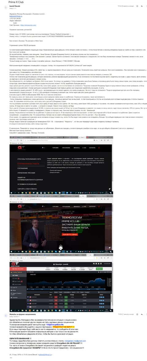 Развод со стороны форекс-конторы Прайм Икс Клуб начался со звонка афериста, который уговорил клиента вложить небольшую сумму. Тупые уговоры, демонстративное увеличения депозита и тут уже клиент отдал аж 800 000 рублей. Последней каплей был несуществующий налог, который он оплатил. Чтобы вывести деньги, жертва пошла по совету друга, который сказал написать в организацию ChargeBack.Me где обещали помочь.