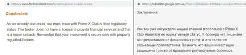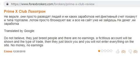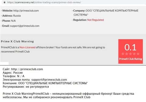 В обзоре экспертов theforexreview com, черным по белому сказано, что Прайм Икс Клуб представляет собой шарашку. Иметь дело с этим брокером опасно для ваших финансов. Предложив сделать небольшой взнос, мошенники высосут из вашего кошелька все деньги.