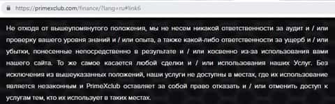 Обязательный пункт всех мошенников на поле форекс торговли о снятии с себя любой ответственности жулики Prime X Club также не забыли включить в договор. Отвечать за свои аферы со средствами клиентов лохотронщикам не придется благодаря жульническому договору.