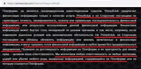 Коронный пункт договора Прайм Икс Клуб о том, что данный лохотрон, называющий себя брокером, не гарантирует достоверности финансовой информации. Ложные сведения, отсутствие всяких гарантий и ответственности за содеянное – вот что обещают аферисты своим клиентам.