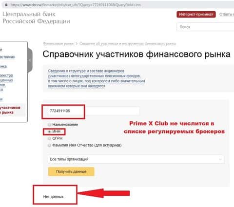 Поскольку Prime X Club является российским брокером, то по закону регулировать его деятельность должен Центробанк РФ. В списке участников финансового рынка на портале cbr ru мошенники не значатся. То есть работа их не регулируется, и доверия они не заслуживают.
