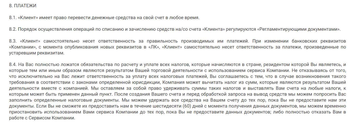 В разделе о платежах указывается, что клиент самостоятельно отвечает за все произведенные платежи на сайте Прайм Инвестинг, уплачивает все налоги.