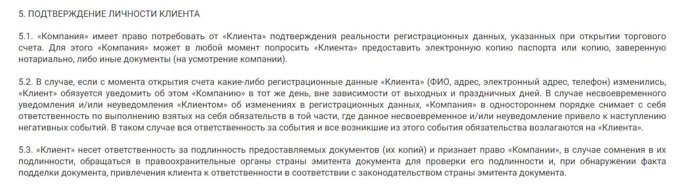 В разделе о подтверждении личности договора компании Прайм Инвестинг говорится о том, что клиент обязан предоставить достоверную информацию о себе.