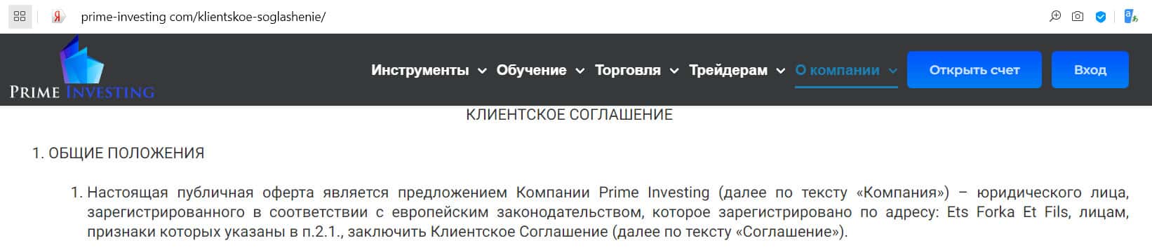 В пункте 1.1 клиентского соглашения Прайм Инвестинг написано, что компания является юридическим лицом, но в действительности это ложь, это обычная шарашкина контора.