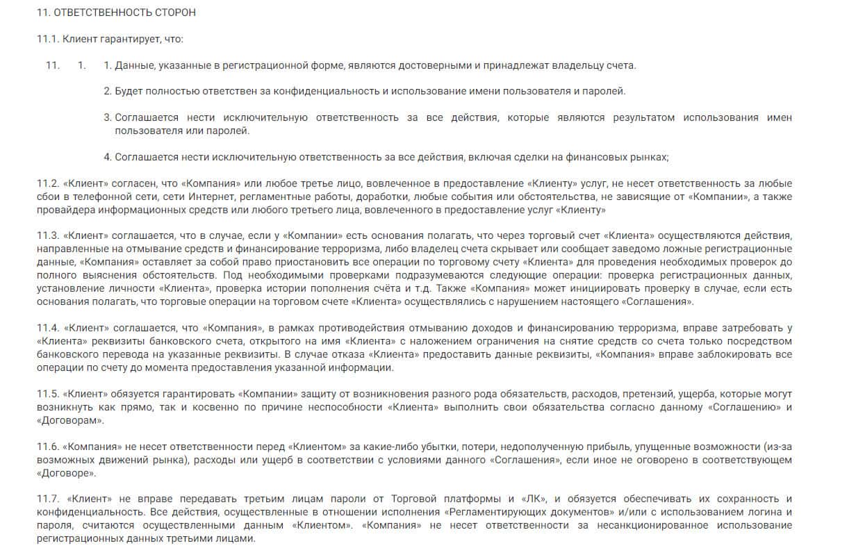 Раздел об ответственности сторон говорит о том, что компания Прайм Инвестинг не несет ответственности за любые убытки клиентов, расходы или ущерб.