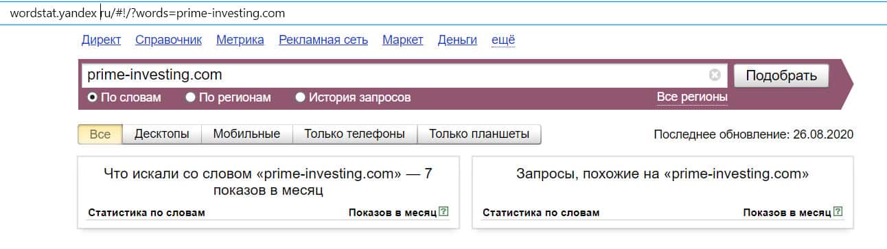 В поисковой системе Яндекс сайт брокерской конторы "prime-investing.com", вбитый в строку с точкой, искали всего 7 раз. Контора явно не пользуется спросом у жителей России.