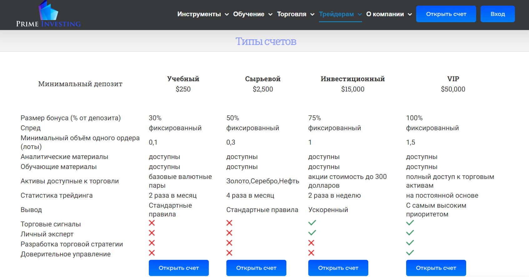Если посмотреть на типы счетов, которые предлагает компания Прайм Инвестинг, то становится ясно, что никакого отношения к форексу эта контора не имеет.