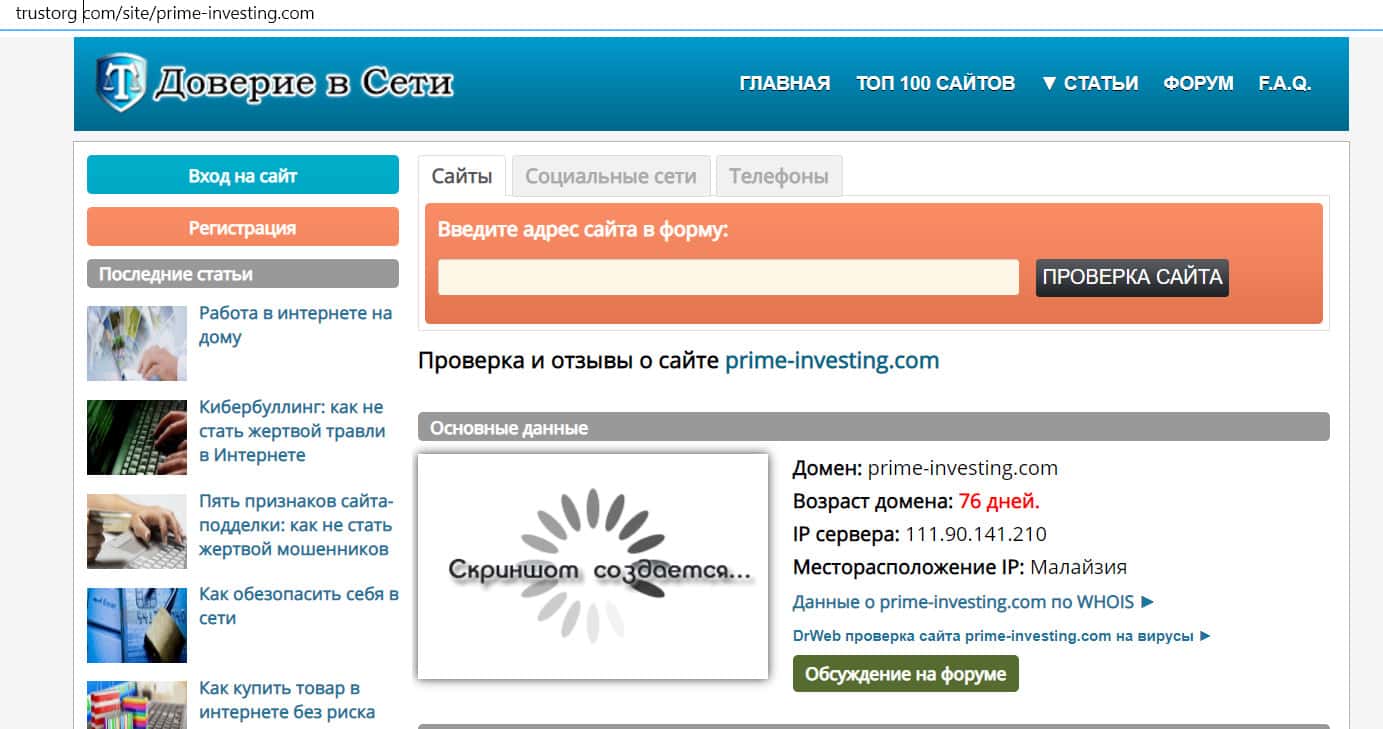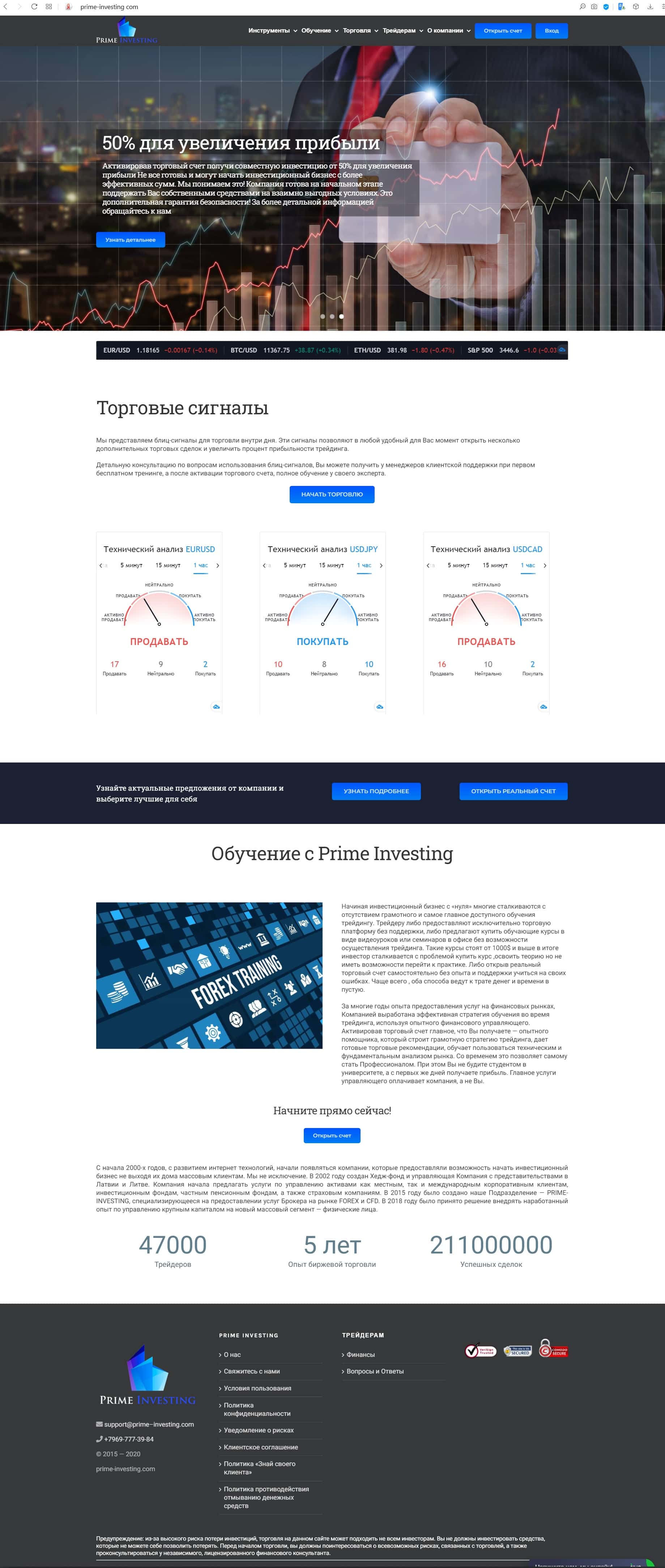 Аферисты, создавшие проект Прайм Инвестинг, постарались сделать красивый сайт, который рассчитан на тех людей, которые мало понимают в трейдинге.