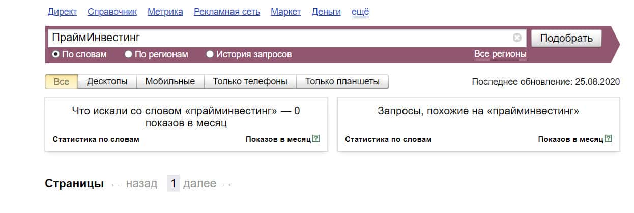 Посмотрим, сколько раз люди искали название бренда "Прайм Инвестинг" на русском языке с пробелом. Незначительное количество запросов.