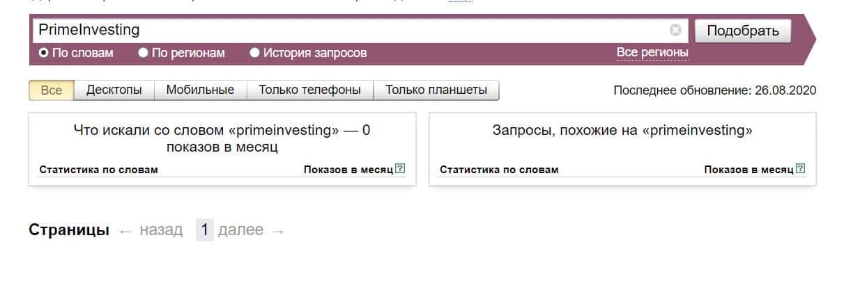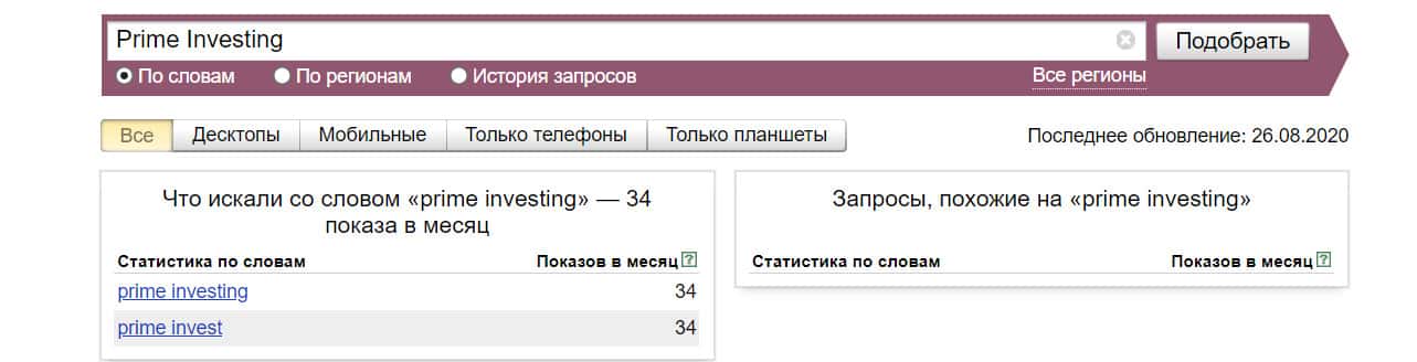 То же название "Prime Investing", но написанное с пробелом, пользователи пытались найти в системе Яндекс всего лишь 34 раза.