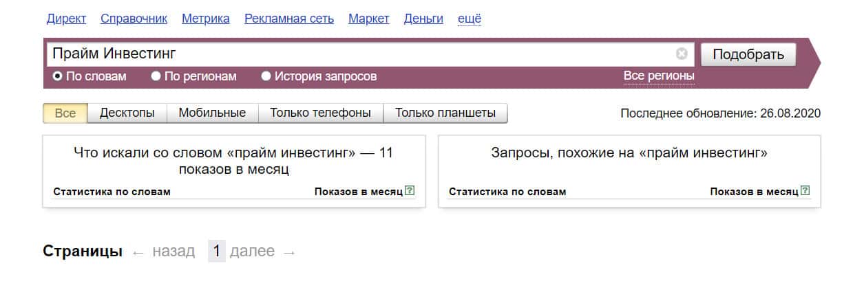 Посмотрим, сколько раз люди искали название бренда "Прайм Инвестинг" на русском языке с пробелом: результат 11 показов.