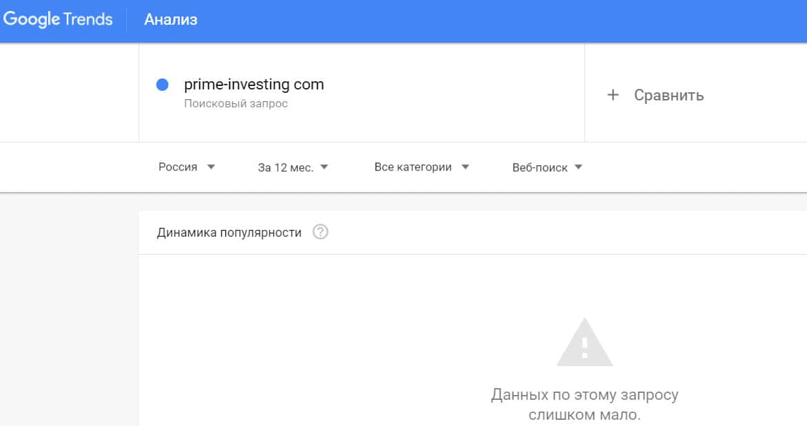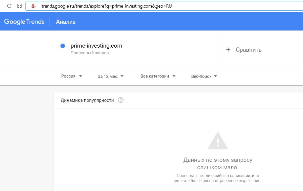 Доменное имя мошеннического сайта "prime-investing.com" вбивали в поисковую систему Гугл слишком редко, поэтому данных по этому запросу практически нет.