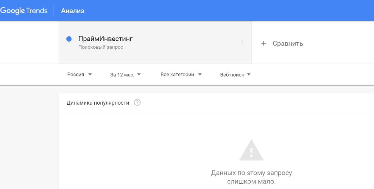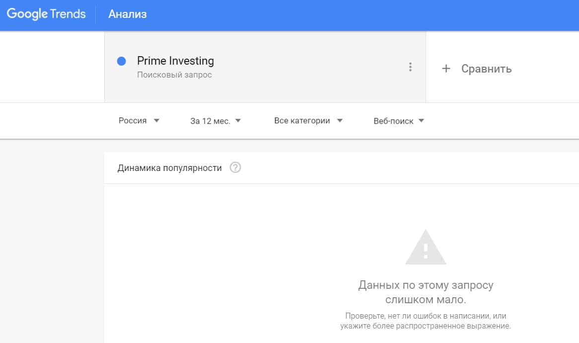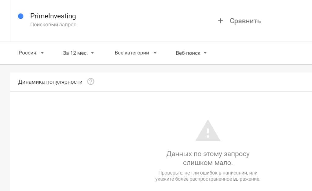 Посмотрим, насколько популярно название бренда "PrimeInvesting", написанное на английском языке. Данных по этому запросу нет, так как никто не искал этот бренд в Гугл.