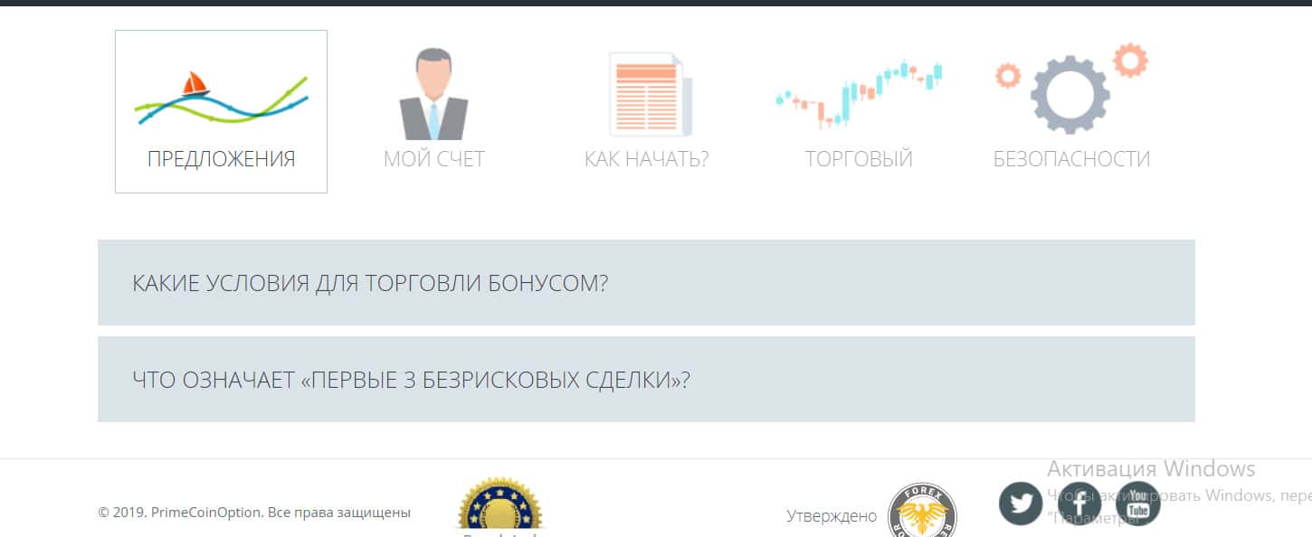 Также на площадке Прайм Коин Опцион есть популярный раздел Часто задаваемые вопросы, как и на многих других брокерских ресурсах. Правда, вопроса там почему-то всего два. Предполагается, что все остальное пользователям понятно. Видно, что сайтик сделан на скорую руку и никто им всерьез не занимался.