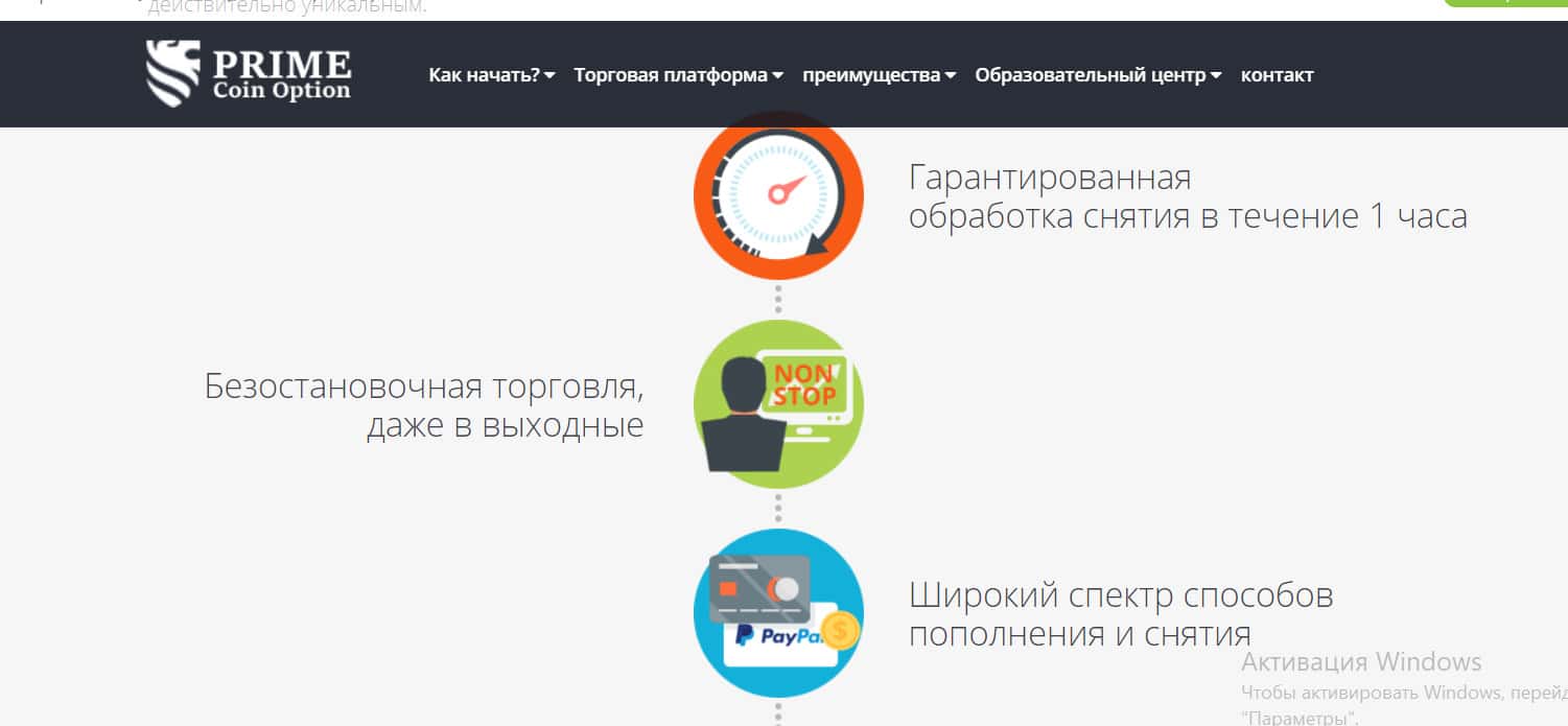 Какие же преимущества есть у компании Прайм Коин Опцион? Самым главным они считают быстрый вывод средств, в течение часа. Так быстро деньги не выводят даже крупные брокеры, и информация никем не проверена. Также речь идет о безопасности и надежной защите данных , но это просто слова.