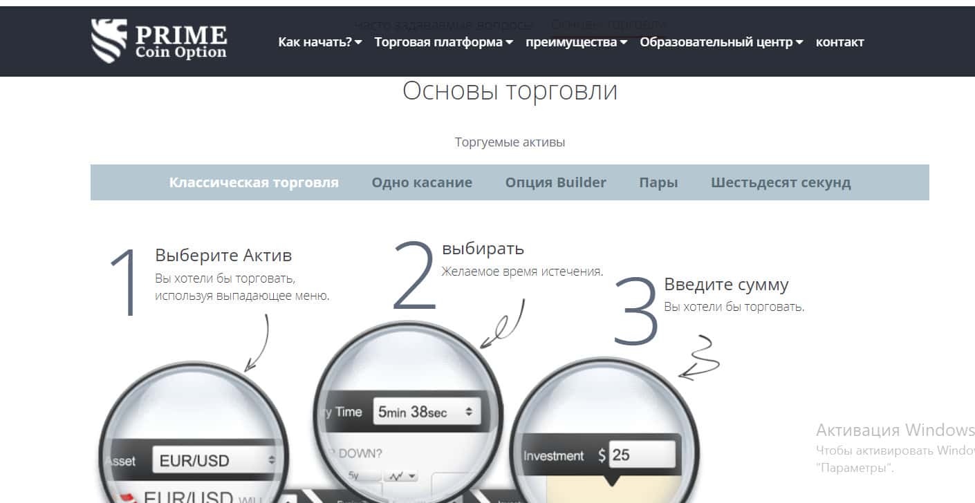 На сайте Прайм Коин Опцион имеется раздел Образовательный центр. Чему же там учат? На вкладке Основы торговли показывают, как пользоваться интерфейсом сайта, на какую кнопку нажимать и тому подобное. Интересно, что, кроме опции Классическая торговля, другие вкладки не работают.