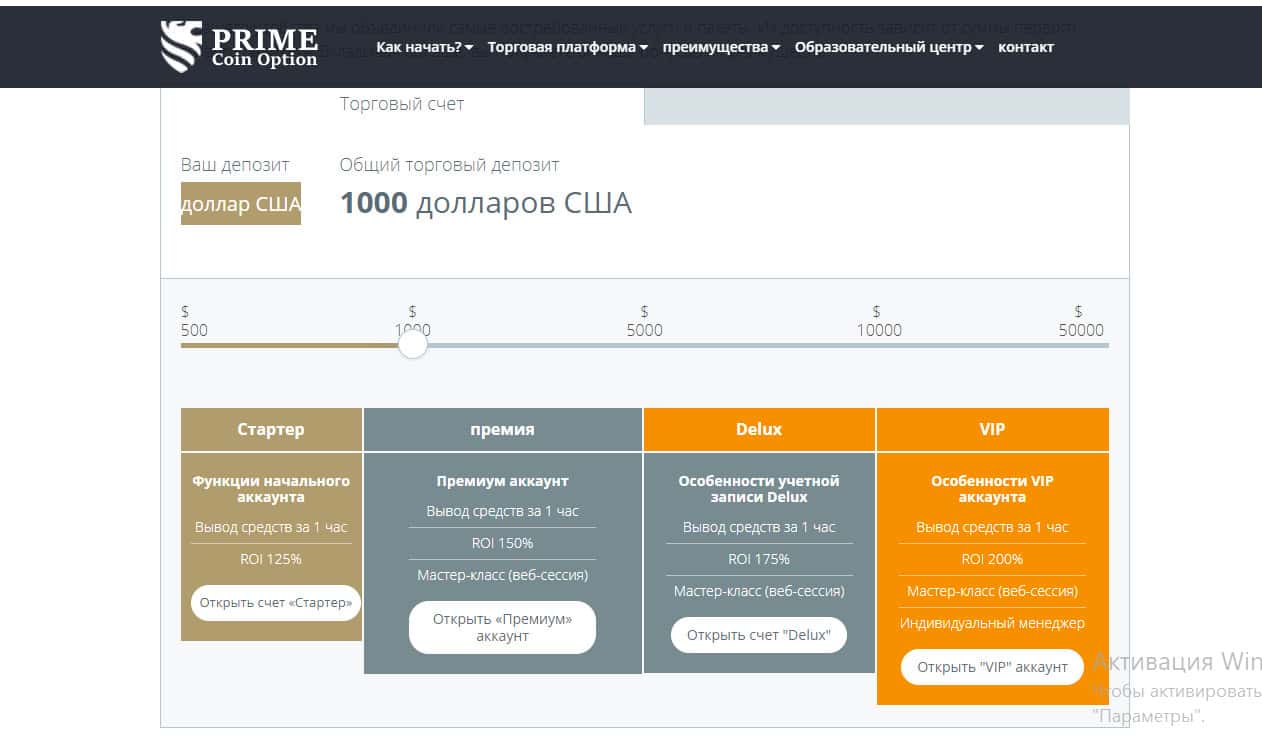 Какие тарифы сайт PrimeCoinOption предлагает трейдерам?