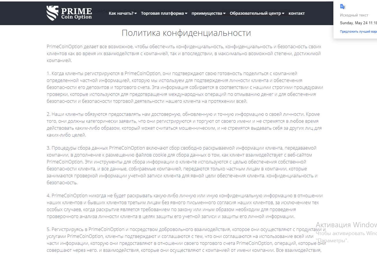 - Политика конфиденциальности брокерской компании Прайм Коин Опцион