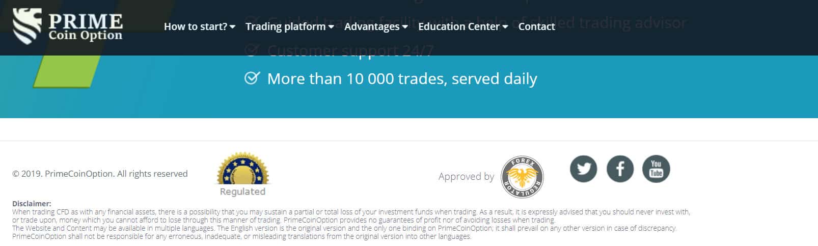 На сайте компании Прайм Коин Опцион внизу главной страницы расположены иконки соцсетей, в которых она якобы зарегистрирована. Это Фейсбук, Твиттер и канал в ЮТубе. Однако, при нажатии на них ничего не происходит. Это очередной фейк, что подтверждает жульнические намерения Прайм Коин Опцион.