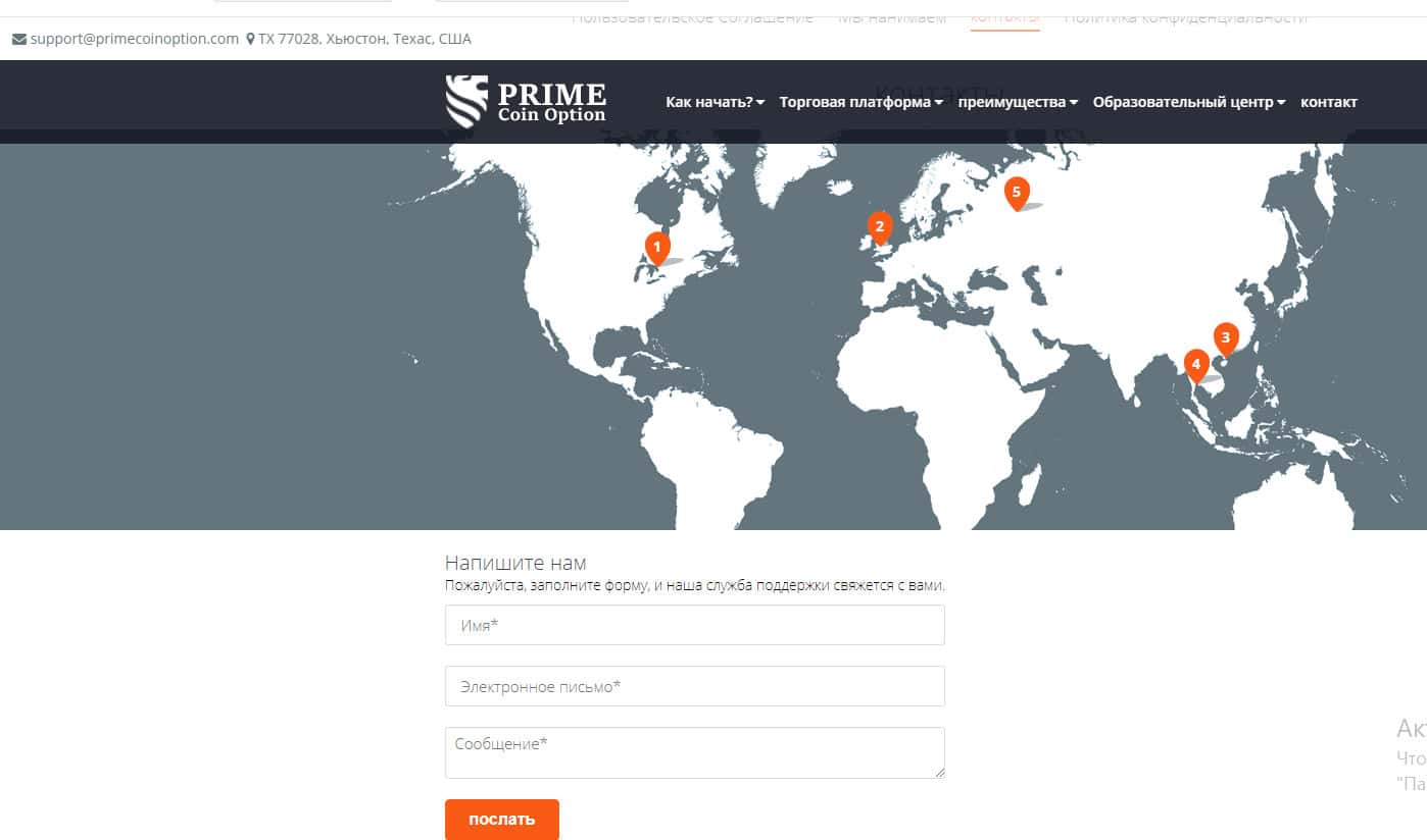 В разделе Контакты мы можем увидеть юридический адрес, который указывают организаторы: TX 77028, Хьюстон, Техас, США. Есть также адрес электронной почты: [email protected]. Внизу раздела имеется форма обратной связи с поддержкой компании Прайм Коин Опцион.