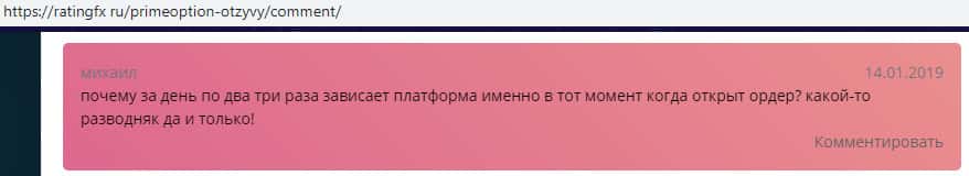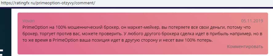 На изображении, расположенном ниже, вы можете наглядно увидеть очередной реальный негативный комментарий в сторону аферистов Прайм Опцион, который довольно стандартно и банально развел очередного наивного пользователя сети интернет на деньги под довольно типичным и ожидаемым предлогом торговли форекс, в ходе которой жулье кинуло клиента.