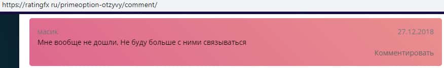 На изображении, расположенном ниже, вы можете наглядно увидеть следующий негативный отзыв в сторону аферистов Прайм Опцион, который связан с тем, что мошенники PrimeOption попросту развели клиента на ввод средств в свою помойку, после чего оперативно слились и перестали отвечать на любые обращения наивного пользователя сети интернет.