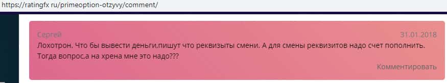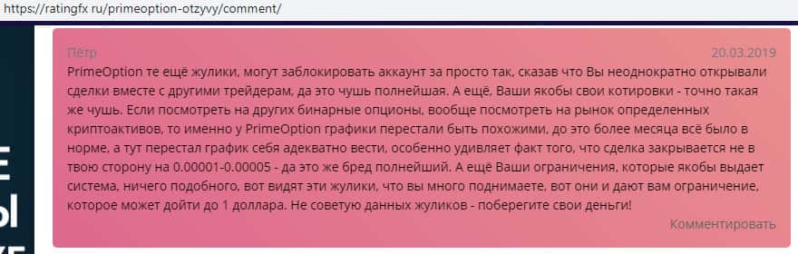 На ниже расположенном изображении вы можете наглядно увидеть и прочесть еще один реальный негативный комментарий в сторону аферистов Прайм Опцион, который связан с тем, что жулики PrimeOption развели на деньги еще одного пользователя сети интернет, после чего оперативно дали заднюю и отказались выводить средства, попутно заблокировав аккаунт.