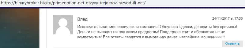 Отзыв о жуликах Прайм Опцион от еще одного недовольного пользователя