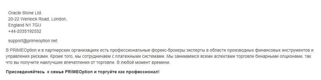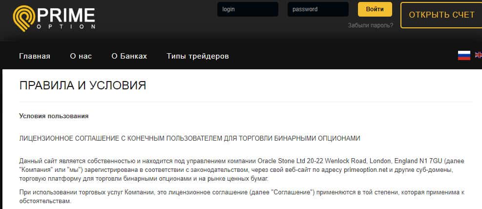 - Перечень условий сотрудничества лохотрона PrimeOption